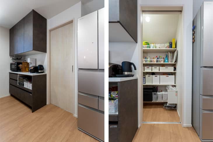 私がこだわったのは、とにかく収納スペースを十分に確保したいということでした。階段下なども含め、あらゆる場所に収納を用意しています。特に便利なのがキッチン奥に取り付けた、パントリー代わりにもなる収納です。食材をはじめ、様々なものをたっぷりとしまっておけるので重宝しています。リビングのベランダをやめた分を、この収納スペースに割り当てた感じです。(奥様)