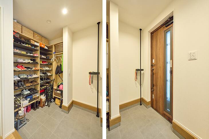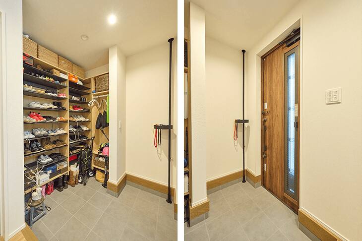 私が特に希望したのは、広い玄関です。マンションの玄関は狭く、採光も十分でありませんでした。やはり家に帰ってきて玄関を開けた瞬間は気持ちもゆったりと解放されたいですから、広くてゆとりある空間にしたかったんです。おかげで広くて明るい玄関ができて、家に帰ってくるのが楽しみです。玄関脇には、オープンなシューズ・イン・クロークを設けました。隣の予備室は将来次女の部屋とする予定ですが、その部屋の一部を削って実現しました。玄関がさらに広く感じられ、靴の出し入れも簡単です。(ご主人)