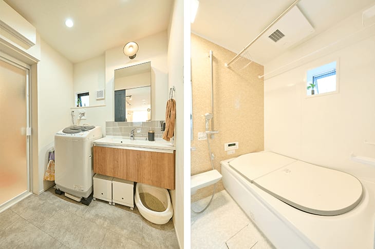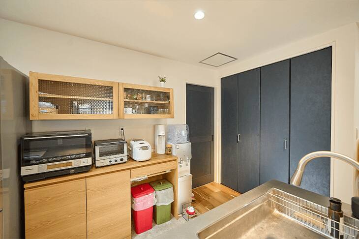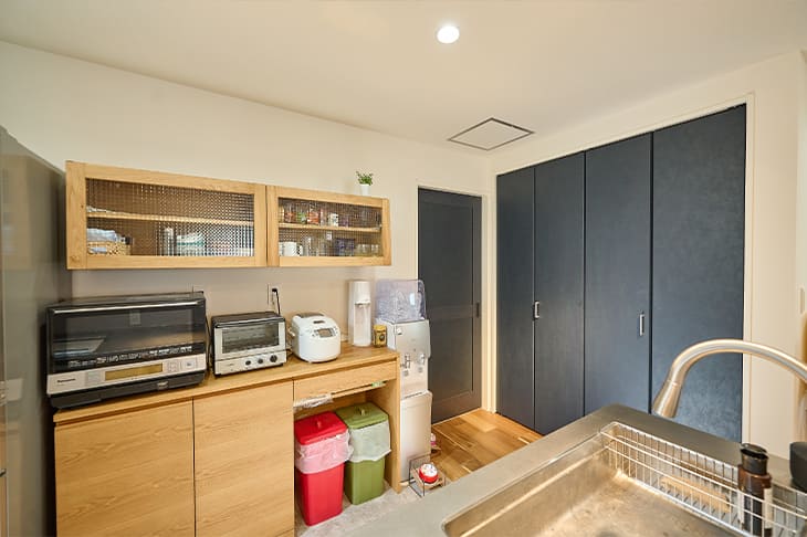 2階のキッチンの隣には脱衣所とお風呂が続いています。キッチンに立ちながら洗濯もできるため、とても合理的な動線となりました。またキッチンにはビルトインの食洗機を設置。乾燥した食器はそのまま背中の食器棚に収納できるので、とても楽です。実は私は食洗機は使っていなかったのですが、主人の強い勧めで使うようになりました。今ではその便利さに毎日感動しています。キッチンにはパントリーも設置しました。ここにはビールや水の買い置き、猫の餌などを収納しています。以前はすべてむき出しで置いていたのですが、パントリーのおかげでキッチン全体がスッキリとしました。(奥様)