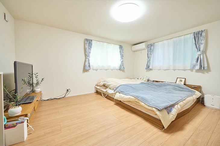 「ゆったりと過ごすために手間は惜しまない」と考えて実現したのが主寝室です。寝転がりながらテレビと目の高さを合わせられるよう、あえてローベッドにしました。子供たちが幼い今は家族4人が"川の字"になって、このベッドで寝ています。洗面所を隣に設けたので、寝る前の歯磨きも簡単。いずれこの寝室には冷蔵庫も置いて、寝ながらお酒も楽しめるようにしたいと考えています。(奥様)