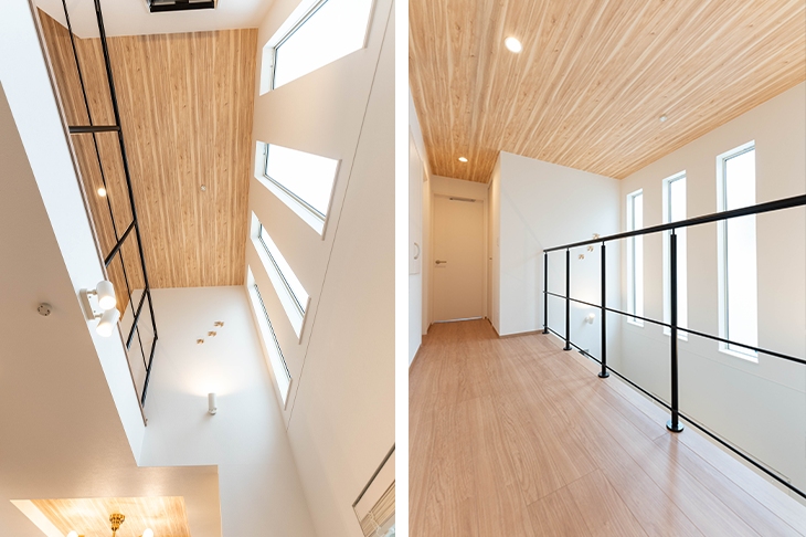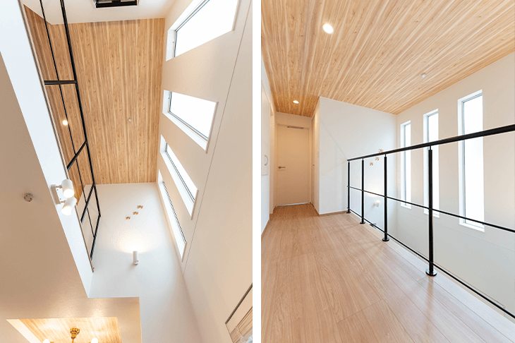 一番こだわったのは、2階リビングルーム真上の吹き抜けです。家族が集まれる、明るくて開放的な空間を実現したいと思いました。そのために3階の居住スペースを少し削りましたが、思い切って吹き抜けにしてよかったと思っています。おかげで2階と3階に一体感が生まれ、2階のキッチンから声をかけても3階にしっかり届きます。子供が大きくなって勉強部屋で過ごすようになっても、「ご飯だよ」と声をかければすぐに降りてきてくれるでしょう。(奥様)