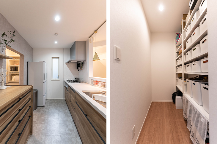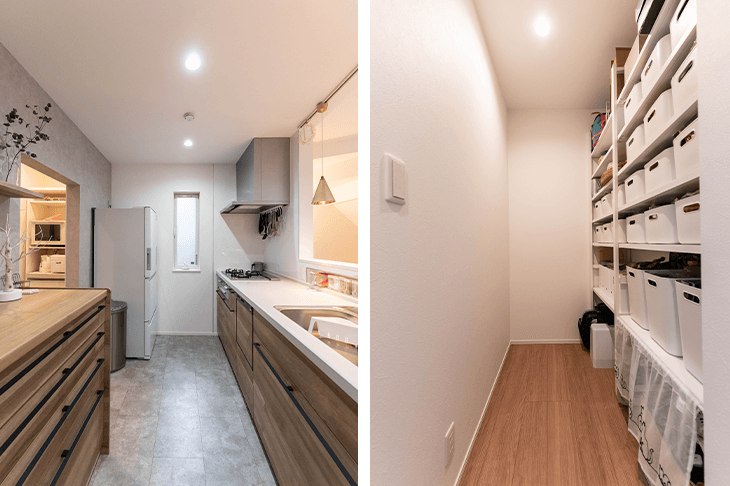収納スペースは大きくまとめてつくりました。例えばキッチンに隣接して大型のパントリーを確保。ここには何でもしまっておくことができ、急な来客があれば子供のおもちゃなども放り込んで、リビングをすっきりさせています。将来子供部屋とする予定の3階の居室には、大きなクローゼットを用意しました。今は家族一緒に過ごす時間が多いのでこうした大きな収納が便利ですが、子供の成長につれて生活が変化したら居室に小さな収納をつくるなど、収納も一緒に変化させていくつもりです。(奥様)