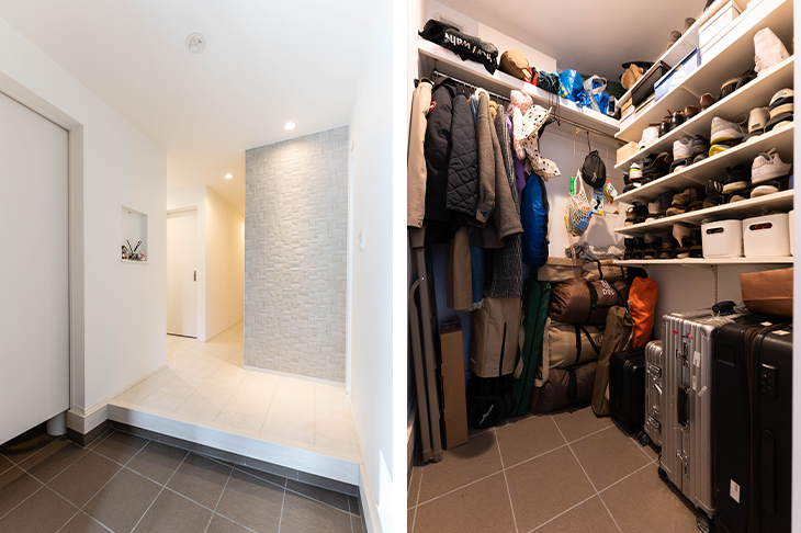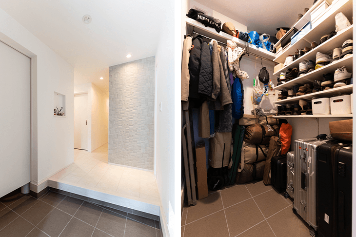 2人とも実家が近いので互いの両親が来たり、仲間が集まったりと、来客は多いほうです。そこでお客様をお迎えするために、エントランスにはあまり生活感が出ないように配慮しました。玄関には大型のウォークインクローゼットを設け、靴はもちろんのこと、コート類やベビーカー、アウトドア用品などを収納できるようにしました。外で使ったものを家の中に上げたくないので、キャスター付きのスーツケースもここです。普段はドアを閉めておくので、中が見えることはありません。