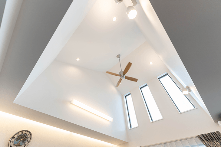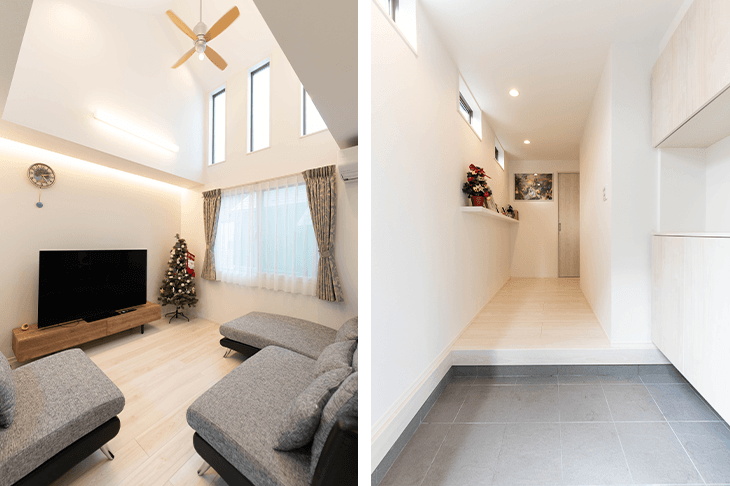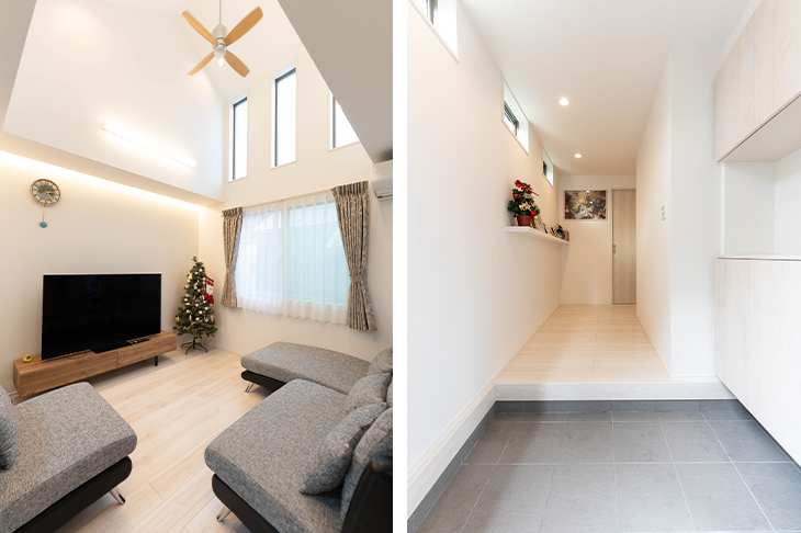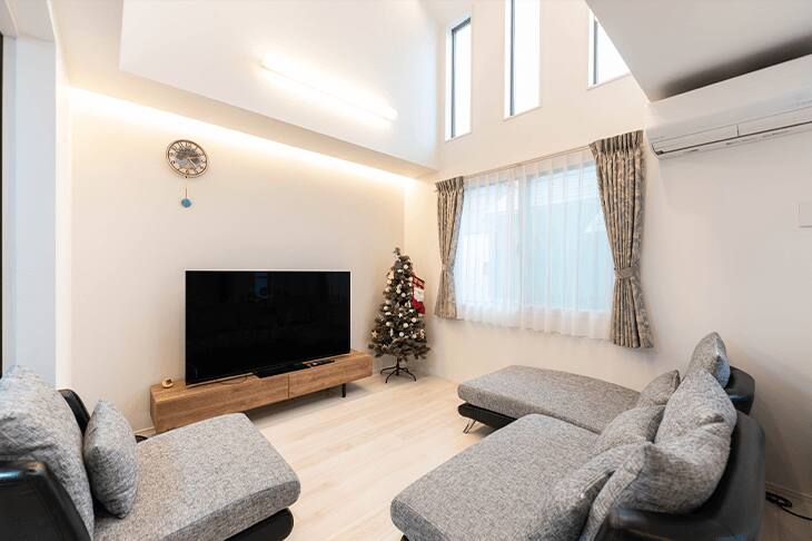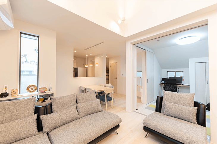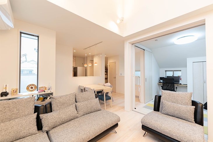 リビングは家族が最も長く一緒に過ごす空間ですから、できるだけ明るく開放的な空間にしたいと思いました。そこでオープンハウスさんの設計担当者の方の提案で実現したのが、大きな吹き抜けです。南向きの窓からはたっぷりの陽が差し込むので、朝からしっかりと明るい空間となりました。隣接の居室は当初、間仕切りで仕切っていたのですが、引き戸に変更。普段は開け放ってリビングと一体の空間として使っています。一角にはワーキングスペースを置き、私のリモートワークに使っています。団らん、仕事と、常にこの部屋で過ごしています。(ご主人)