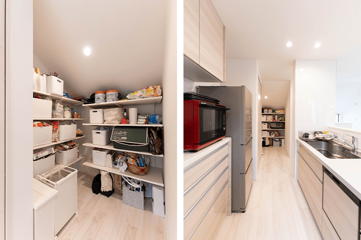 大型のウォークインクローゼットを1階玄関正面に設け、2階キッチンにはオープンタイプのパントリーを設けました。ウォークインクローゼットにはコート類やスーツケース、ひな人形やクリスマスツリーなどの季節もの等を収納しています。パントリーには買い置きの食材などを収納。マンション時代はモノがあふれかえっていたのですが、今はすっきりと片付いて助かっています。パントリーはオープンなので、足りないモノ、買い足しが必要なモノがすぐ確認できるという点でも便利です。(奥様)
