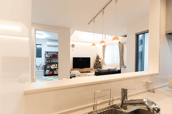 キッチンは、2階全体が見渡せる位置にあります。以前の賃貸マンションではキッチンに立つと部屋の中が見通せず、歩き始めた娘の姿が見えないことがとても不安でした。その点このキッチンでは、水仕事をしていても家族がどこで何をしているか、一目でわかります。家族が集まる空間を見渡せる、司令塔のようなキッチンです。(奥様)