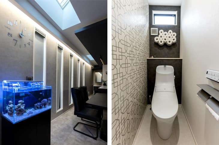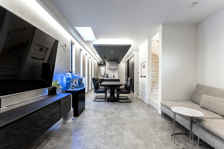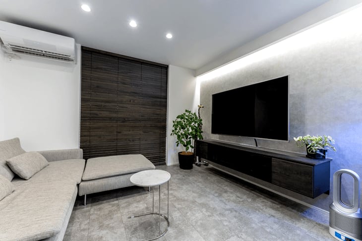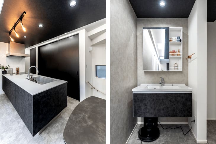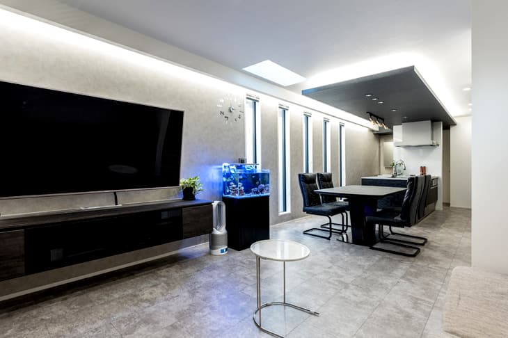 「ホテルライク」が私の住まいづくりのキーワードでした。特にLDKはデザイン性にはこだわりたかったんです。そこでキッチンや洗面台は、宙に浮かんでいるような印象のフロートタイプを選択。床材はダークな大理石調のものを選びました。とても落ち着いてしゃれた雰囲気になり正解でした。(奥様)