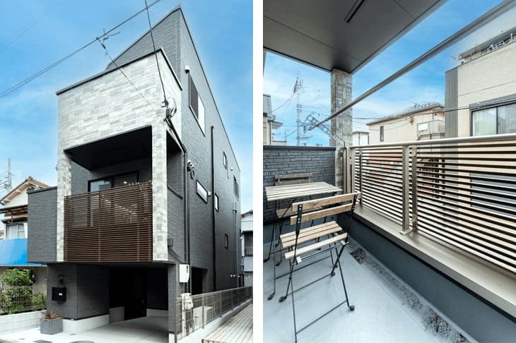 外観のポイントは「高見え」。いかに高級に見えるかにこだわりました。サイディングも、こんな感じがいいと私の方でお願いして、ダークな感じにしていただきました。狭いですがベランダを設けたのも「高見え」を狙ってのことです。夫婦ともお酒が好きなのでベランダで飲むこともあります。近々、ランプタイプの照明も取り付けようかと考えています。(奥様)
