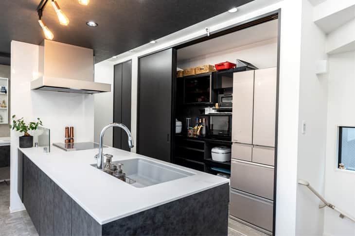 みんなで集まってにぎやかに過ごせる空間が絶対条件でしたから、2階のLDKにはとことんこだわりました。ここですべてが済ませられるようにしたいと考え、水回りはひとまとめに。みんなで楽しく過ごしているときに1階まで下りていきたくないから、トイレも設けました。ただトイレが視界に入るのは嫌なので、キッチンに壁を設けて視線を遮るようにしました。また、生活感が出やすいパントリーには引き戸を設けて、冷蔵庫や食器棚も隠せるようにしました。(奥様)