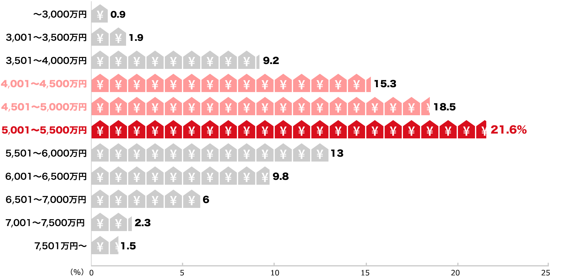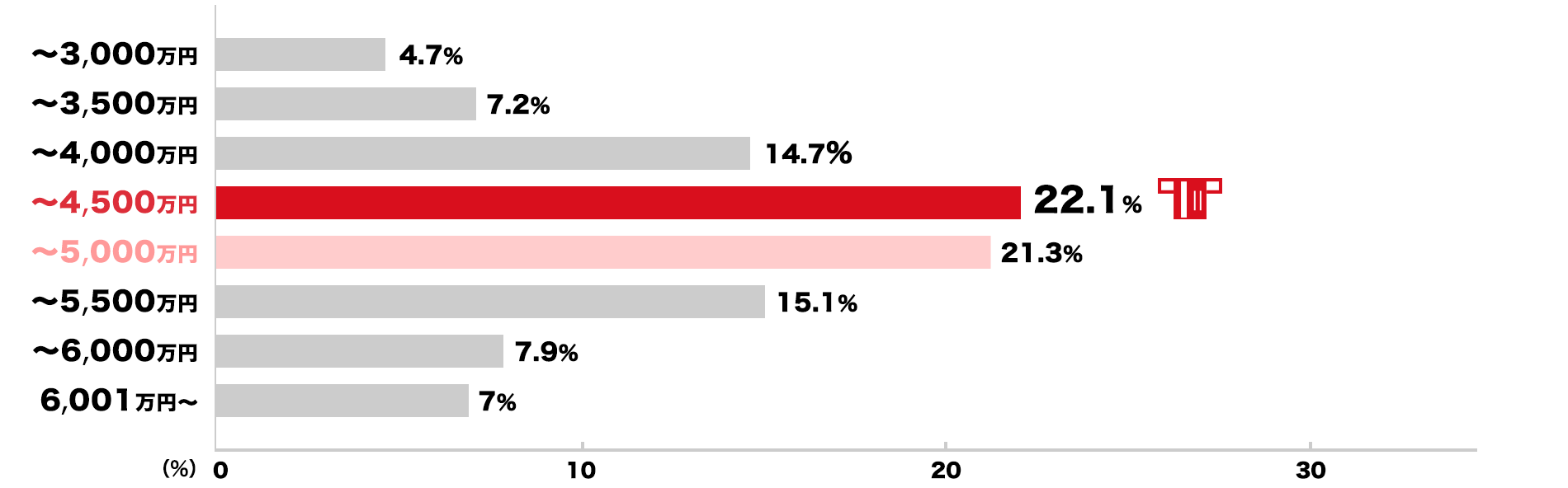 「5,001万円〜5,500万円」が1位で21.6%、「4,501万円〜5,000万円」が2位で18.5%、あわせて40.1%という結果に。次いで「4,001万円〜4,500万円」が多く、「5,500万円以下」が全体の約6割を占めています。