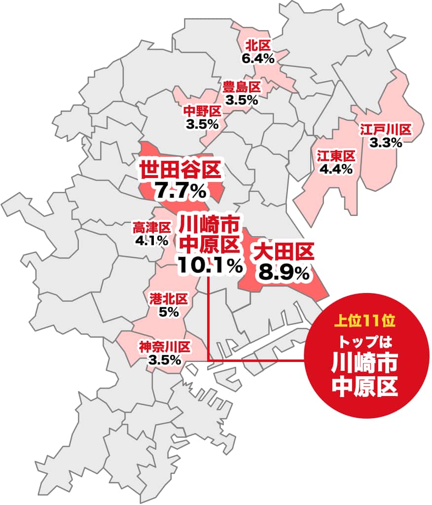 武蔵小杉の再開発で注目の集まる中原区がトップ。駅からの距離にもこだわって。