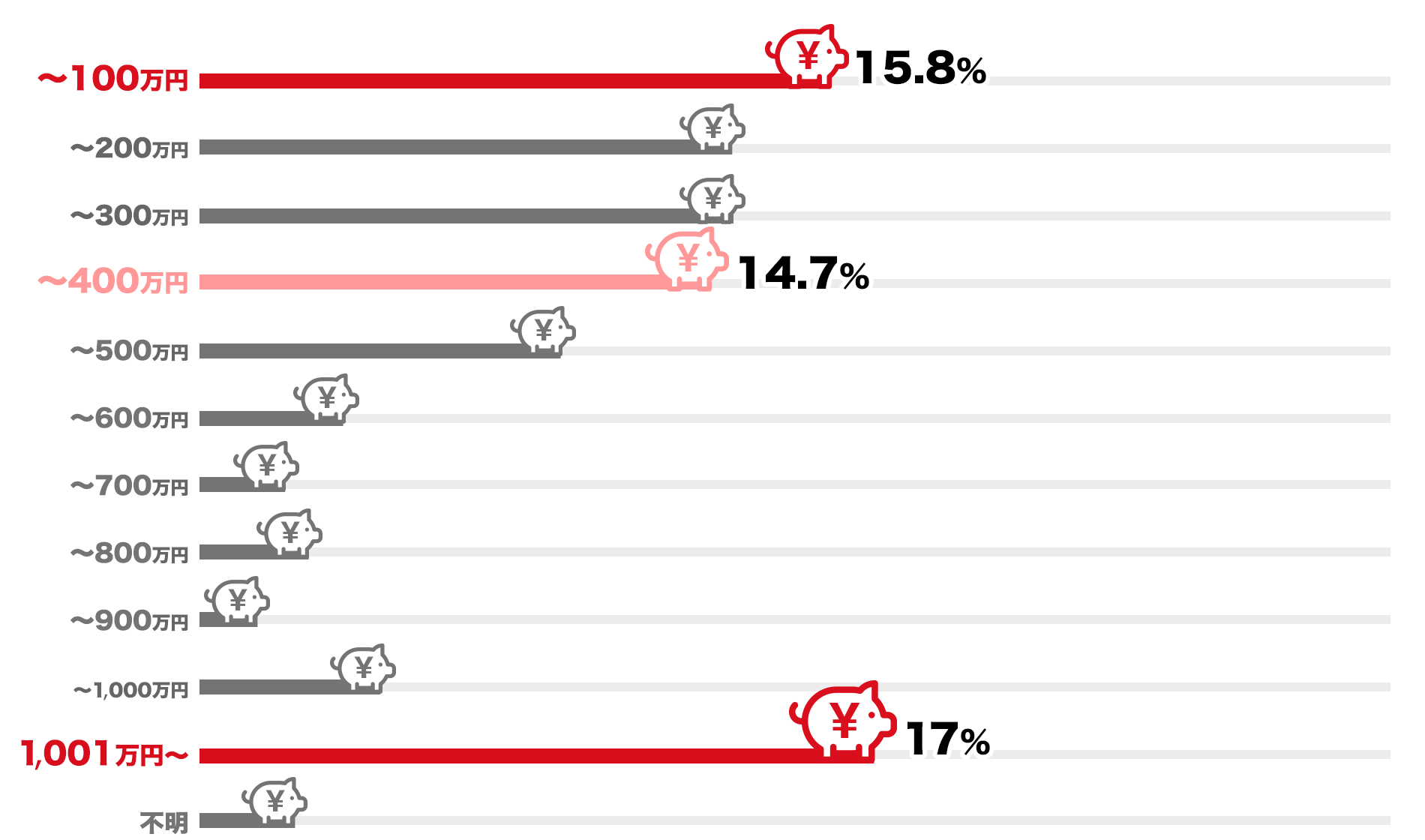 「1,001万円〜」と答えた方が最も多く17%。次いで「100万円以下」が15.8%、「400万円以下」が14.7%と続きます。頭金が400万円以下で購入された方と1,000万円以上用意された方に、大きく二分されます。