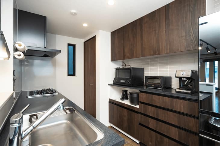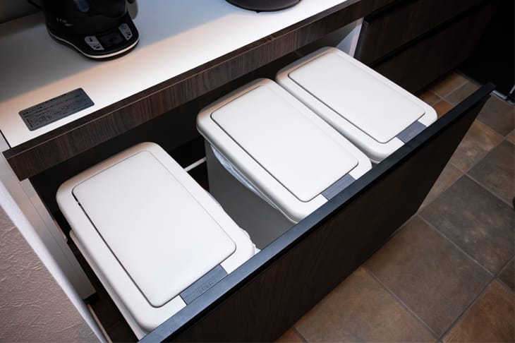 システムキッチンはショールームで見て、90センチ高のものを選びました。私は背の高い方なので、腰の負担もなく、使うことができています。私はとにかくキッチンにモノが出ているのが嫌だったので、全部隠せるようにしてもらいました。冷凍庫も棚に隠れるようにし、食器類などもすべて背面収納にしまっています。特に気に入っているのが背面収納下のダストボックス。分別したゴミを分けて、目に見えないように収納できるのでスッキリしています。(奥様)
