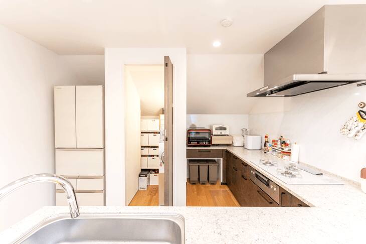 パントリー、冷蔵庫スペースもキッチンに集約させており、とても効率的な動線となっています。私の作業はこのキッチンスペースですべて完結するので、リビングルームで遊ぶ娘を見ながら、手際よく進めることができます。(奥様)