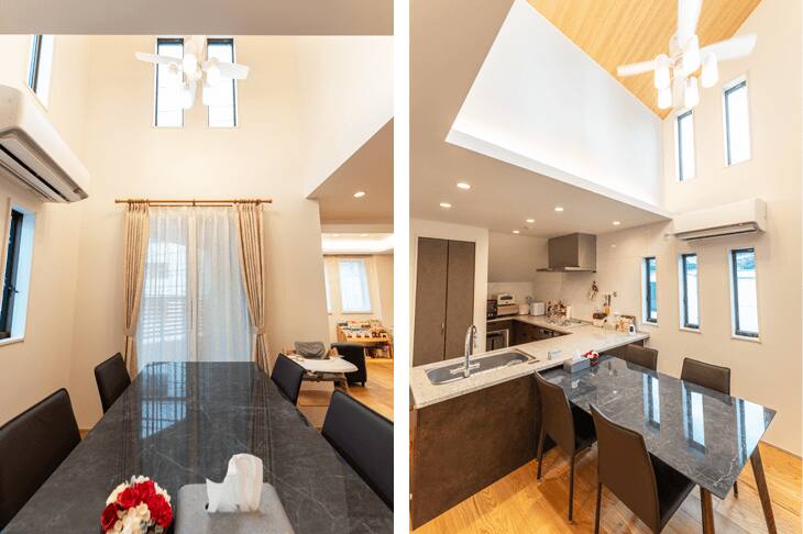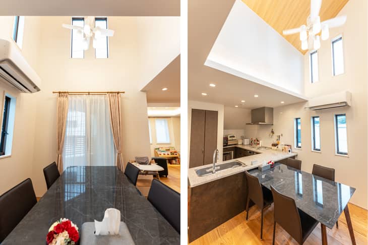 とても気に入っているのが、2階と3階をつなぐ大きな吹き抜けです。これも当初の販売プランにはなかったもので、開放的な空間にしたいという私たちの希望に応えて、設計の方が提案してくださいました。採光も十分で、想像以上に明るく広々とした空間ができました。娘も時々上を見上げては、青空に向かって、歓声を上げています。