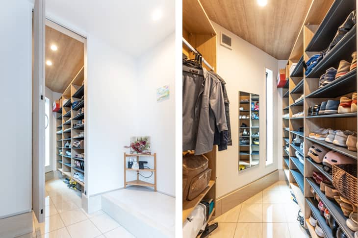 3階には北側斜線を利用して収納スペースを置き、クリスマスツリーなど季節のものを何でも収納しています。1階の主寝室のウォークインクローゼットには床下収納も設けました。特に気に入っているのは、玄関脇のシューズインクローゼットです。ここには靴やコート類、ベビーカーなどを置いています。湿気がこもりやすく、臭いも気になりますから、換気扇をつけるとともに、窓を設けて、空気の入れ替えができるようにしました。