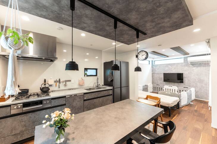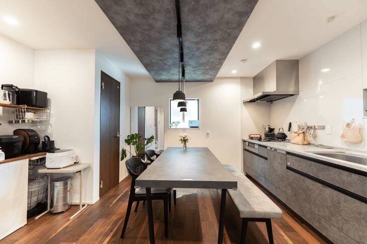 2階のキッチンは標準プランではL字型だったのですが、壁につけたI型に変更しました。その分、ダイニングのスペースを広げ、大きなテーブルを置けるようにしました。私の実家も近いですし、みんなで一緒に座れる場所をつくりたかったからです。思った通り、ちょっと詰めれば10人は一緒に座れるダイニングが実現できました。折り下げの天井もおしゃれで、気に入っています。