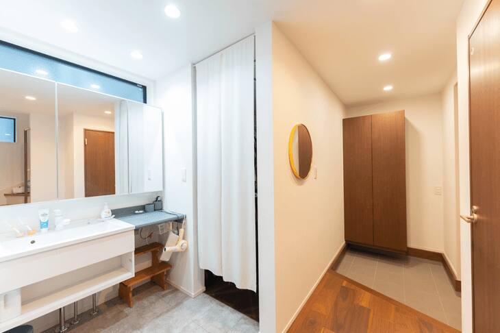 私がフルタイムで働いていることもあって、家事動線はなるべく無駄がなく、合理的にしたいと考えました。そこで工夫したのが、1階です。ウォークインクローゼットを居室に設けるのではなく、玄関を入ってすぐのところに設置し、家族の衣類はコート類も含めてすべて1ヵ所に収納できるようにしました。