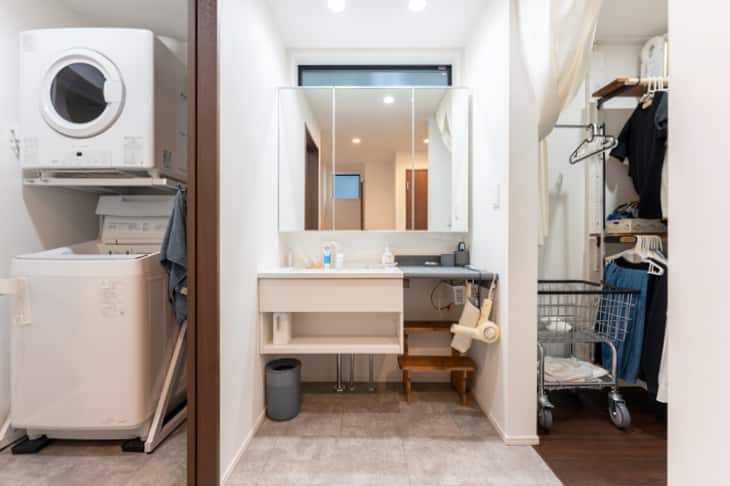 このウォークインクローゼットは洗面所・洗濯スペース・浴室と隣り合わせで続いており、おかげで洗濯・乾燥した衣類を数歩で収納できます。テキパキと効率的に動けるので助かっています。(奥様)