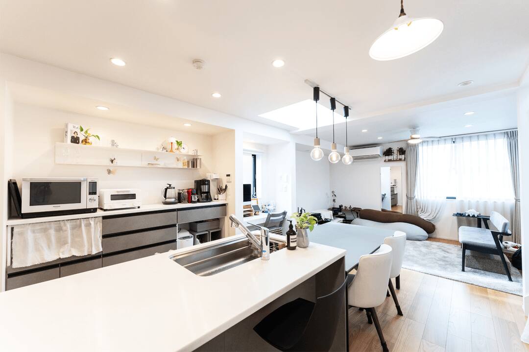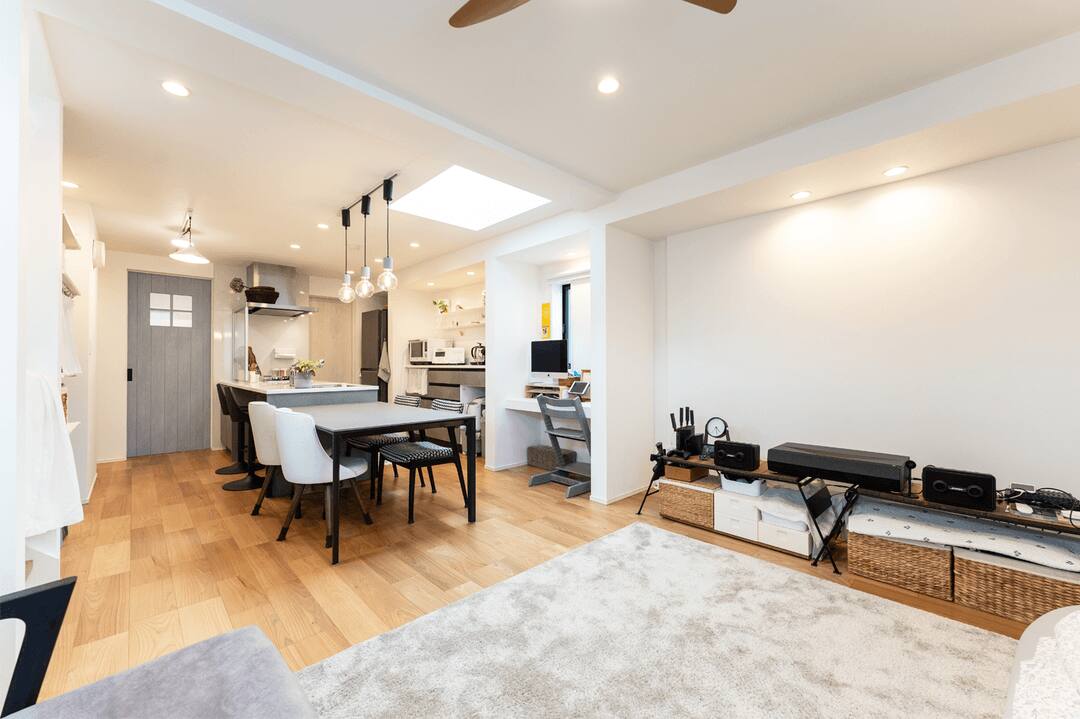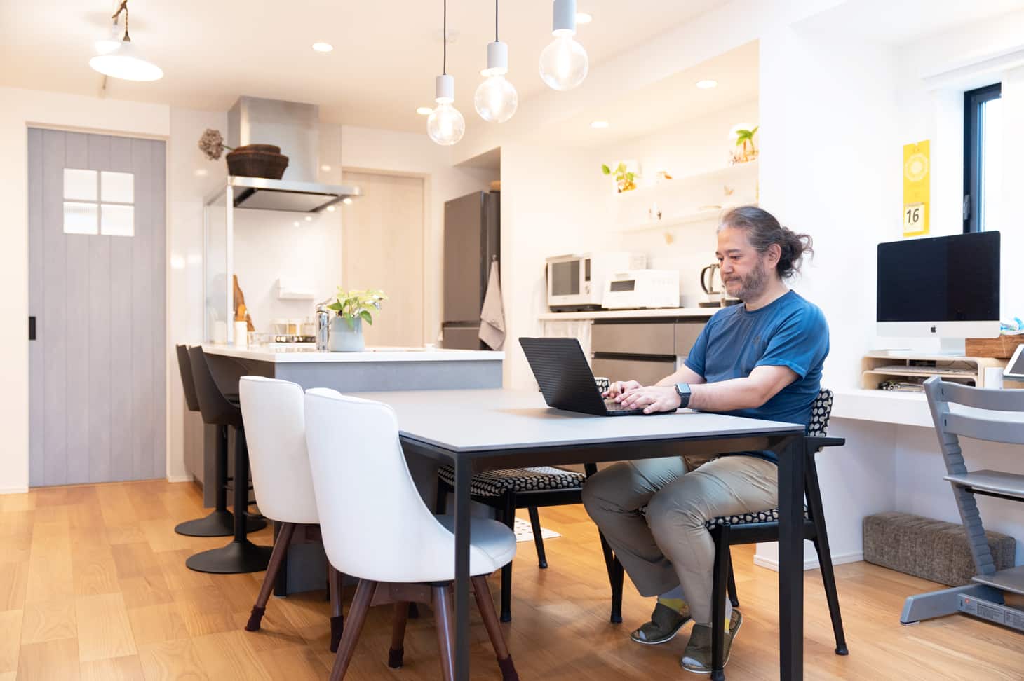 元々は1階にLDKを配置する予定でしたが、リビングが狭くなる可能性や採光の不安がありました。しかし、2階にLDKを配置したことで、すごく快適になりました!特にフルフラットのキッチンは、ダイニングテーブルと横並びにしているので、配膳も片付けも本当に楽で助かっています。(奥様)