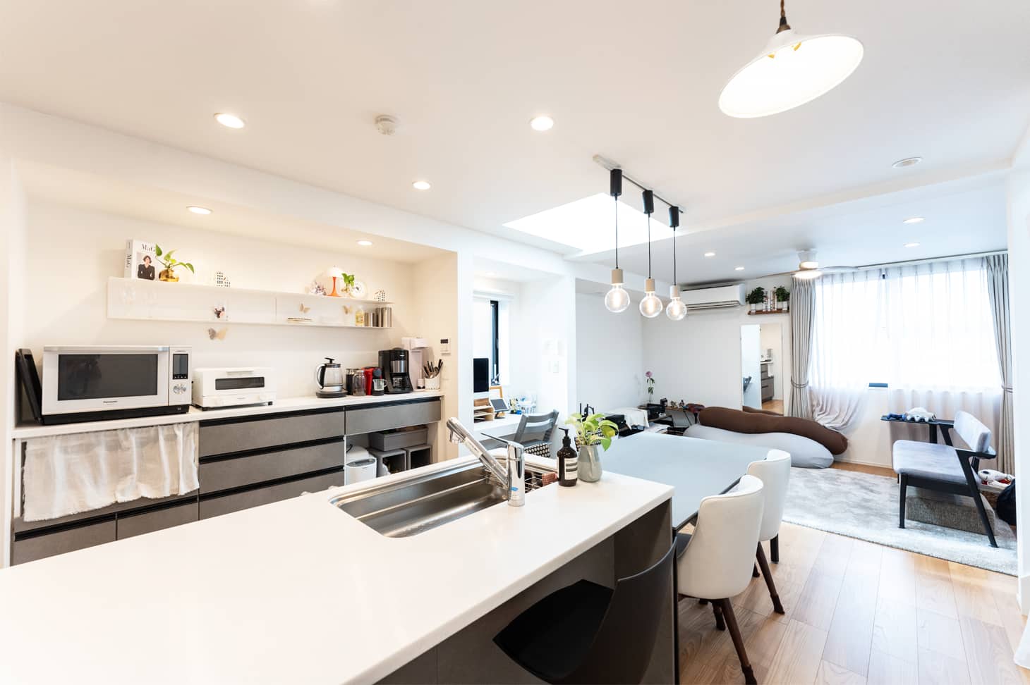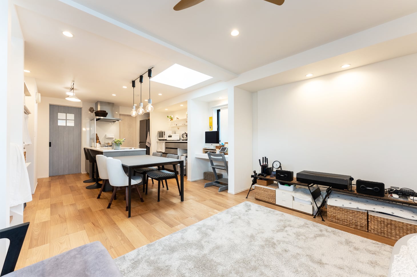私はキッチン周りには特にこだわりました。収納を充実させたことで、ごちゃごちゃしがちだった食器などもスッキリ片付き、料理も効率的にできるようになりました。天窓もあり、リビング全体が広々として明るく見えますね。プランが自由に選べて悩みましたが、納得のいくものになりました。(奥様)