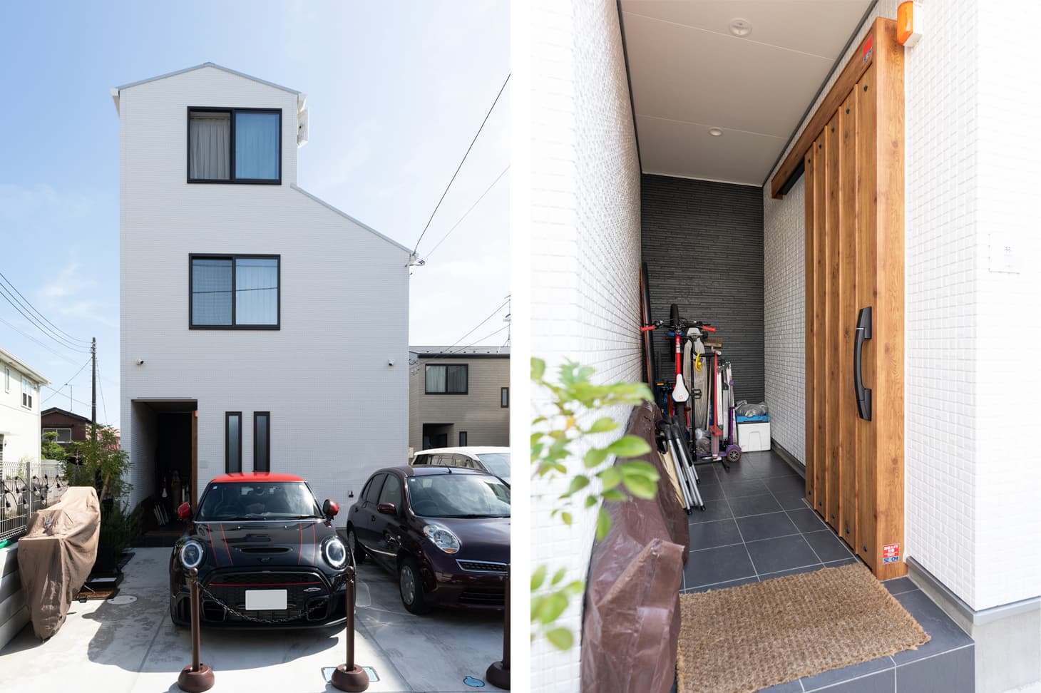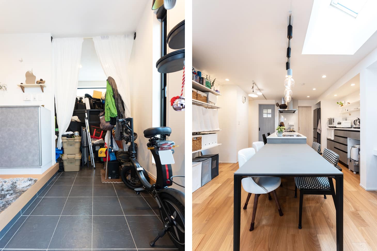 私はキャンプやサーフィンが趣味なので、どうしても土間が欲しかったんです。キャンプグッズって大きいものが多いですし、サーフボードなんかも置きたかったので、玄関先に広い土間があるのは本当に便利ですね。玄関ドアを引き戸にしたのも、荷物の出し入れがスムーズで、本当に助かっています。動線にこだわった家なので、生活のしやすさが格段に上がりました。(ご主人)