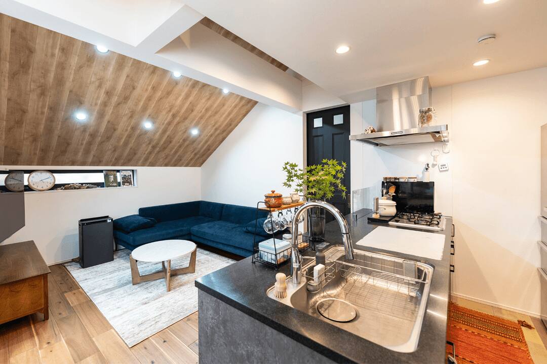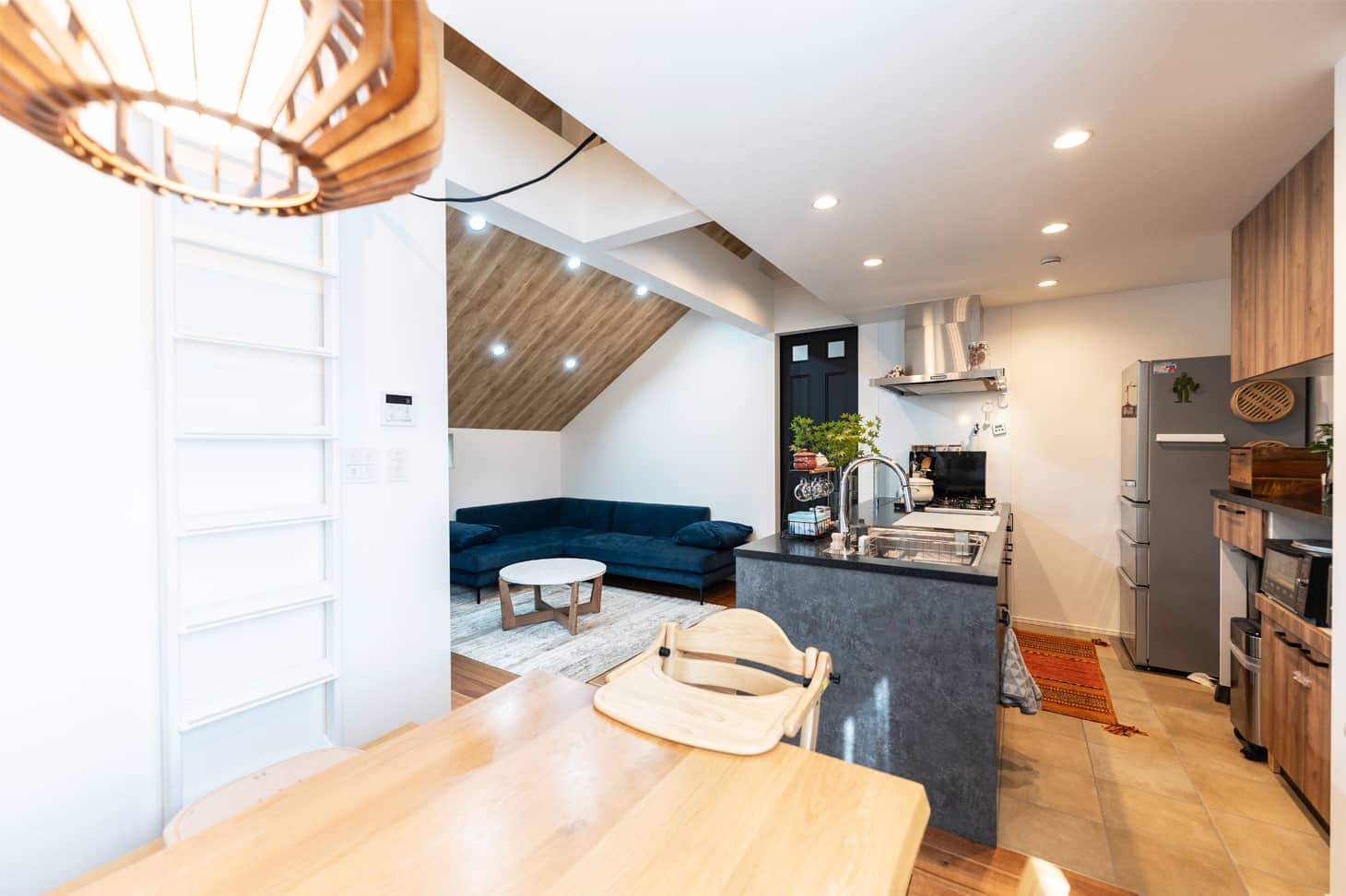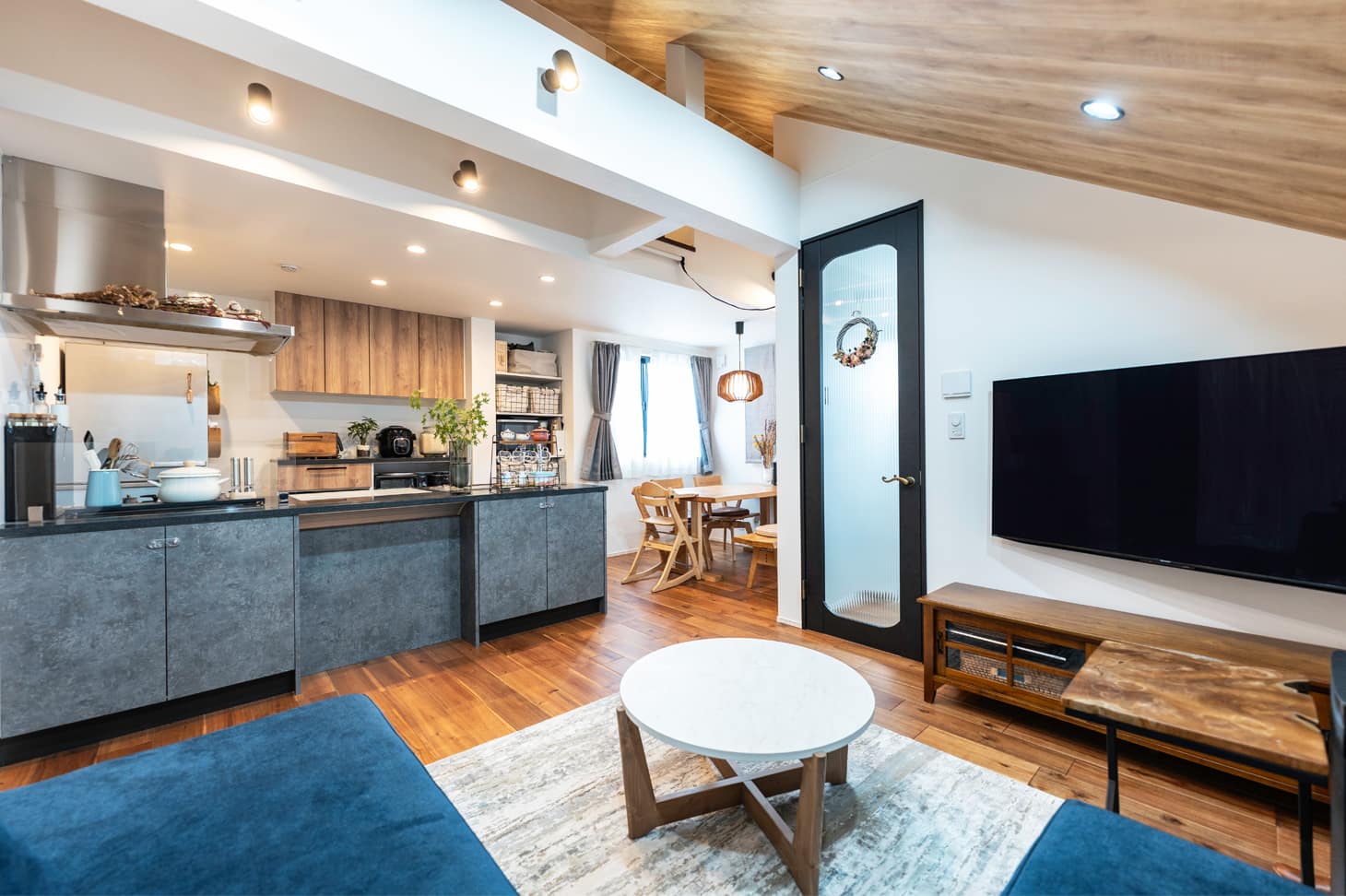 ハイドアを採用したのも大きかったですね。天井が高く見えるので、リビング全体が広々と感じられます。キッチンはフルフラットの対面式にして、カウンターとしても使えるようにしました。将来は、子どもと一緒に料理をすることなどもできるといいなと思っています。(奥様)