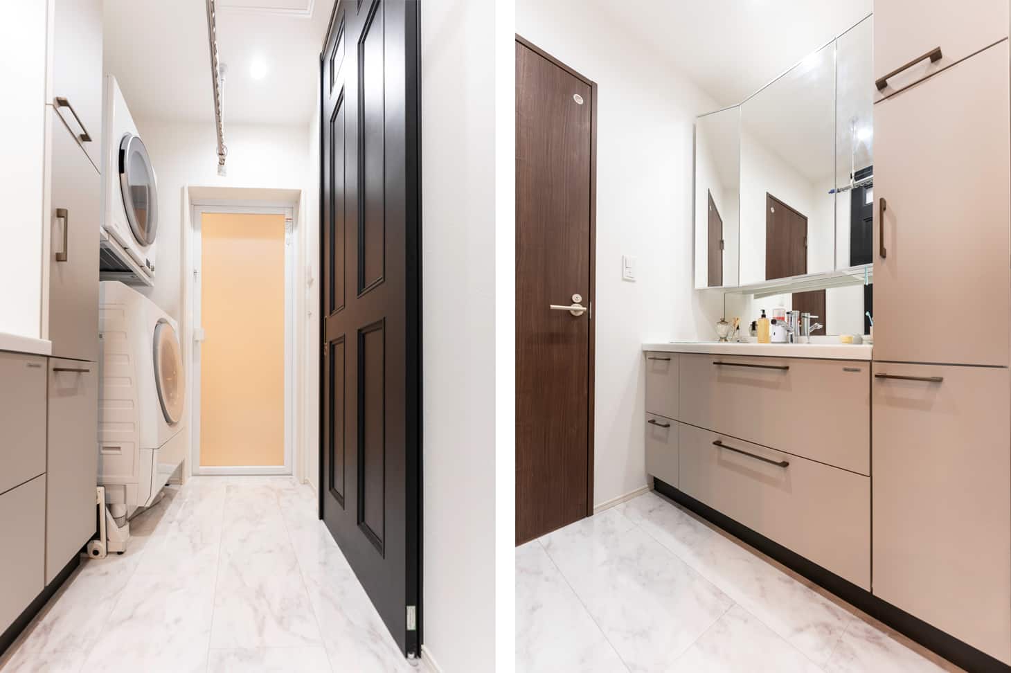 洗面台は、子供がいるので広いものが希望でした。ホテルライクな雰囲気にしてもらったので、毎日のメイクも快適です。(奥様)