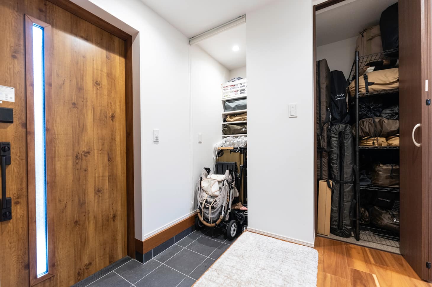 一つ一つの収納スペースが大容量なので大変助かっています。リビング近くの収納には散らばりやすい書類を、玄関収納には夫のキャンプ用品やベビーカーなどを置くことができ、とても便利です。玄関の印象から、家全体の広さのイメージが決まってしまうと思っていたので、ゆったりとした空間にしました。(奥様)
