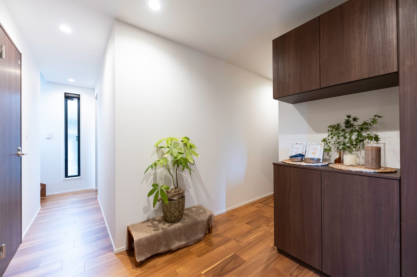 まだ先のことだと考えていた家づくりでしたが、偶然の出会いから購入を決断されました。限られた土地の広さでもリビングを広く見せる工夫や、豊富な収納、ゆったりとした玄関など、たくさんの理想を詰め込んだこだわりの家が完成しました。