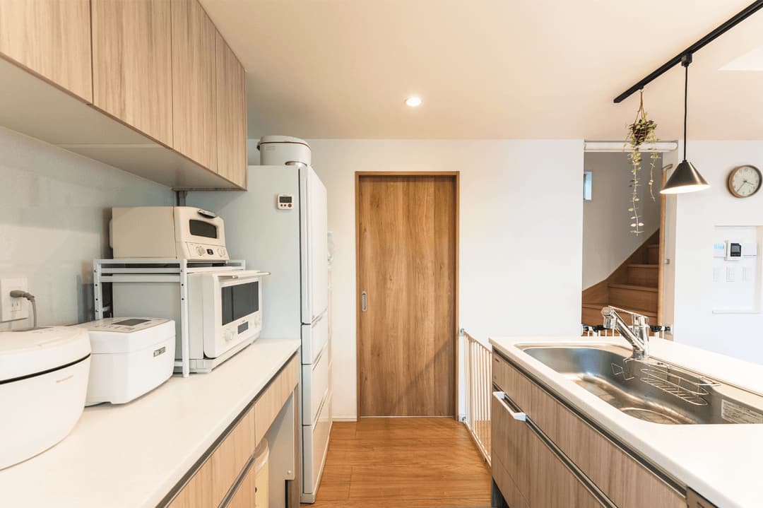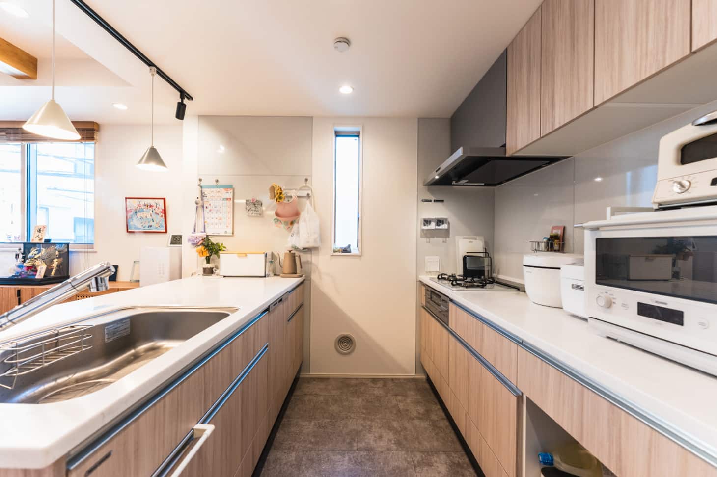キッチンは、使いやすいカウンターキッチンにしたいと思っていました。幅や広さの兼ね合いで二の字型になりましたが、 実際に使ってみると広々使えるし、動線が非常にスムーズで、すごく使い勝手がいいんです。(奥様)