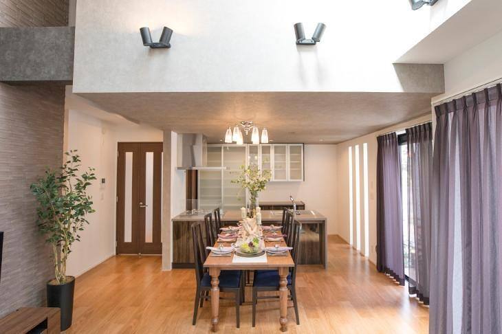1階のLDKは、20.17畳の贅沢な大空間。リビングには、5.3mの大きな吹き抜けが広がり、華やかで開放的なLDKになっています。普段は家族が集まって羽を伸ばし、休日はゲストとともに賑やかに過ごせる、居心地のいい憩いのスペースに。