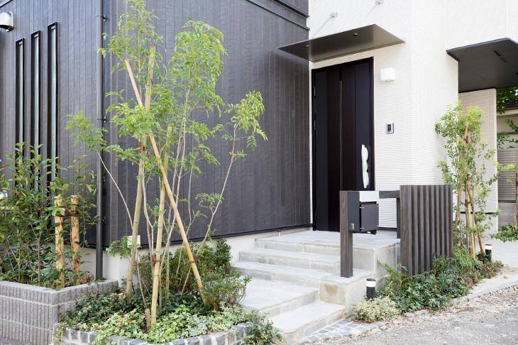 植栽が彩るゆるやかな階段を上って、玄関へ。木の質感を再現した門柱やシャープなデザインの雨よけは、シンプルでありながら贅沢なおもてなし空間を演出しています。