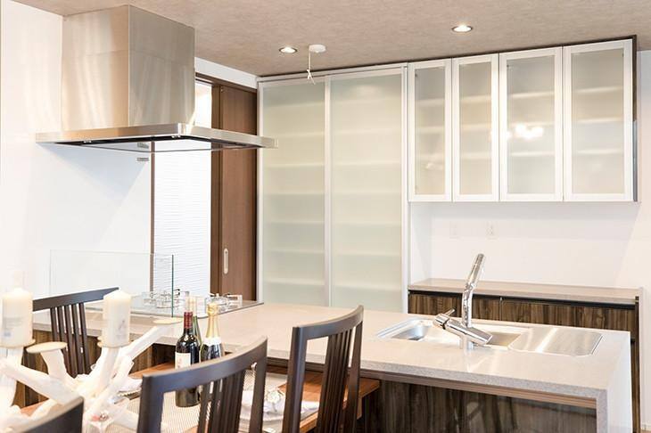 玄関ホールから直接入れるキッチンは、260cm幅のワイドでフラットなペニンシュラタイプ。食器棚やパントリーなどの収納スペースが背面にたっぷり備え付けられているので、お料理やホームパーティー好きな家族にもぴったりです。