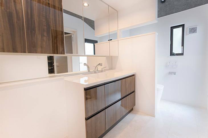 オープンなトイレスペースにつながる洗面所は、遊び心のある設計。天井の間接照明で、ホテルライクなリラックス空間を演出しています。もちろん収納スペースも、洗面台の上下とサイドのキャビネットにたっぷりと確保しました。