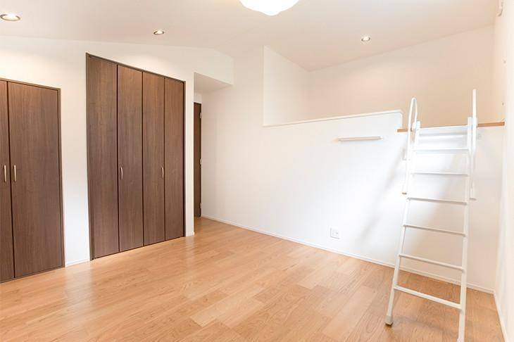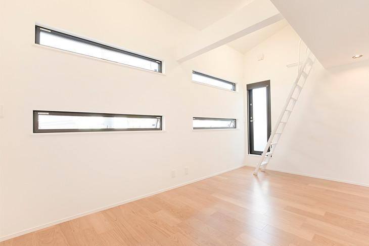 9.45畳に、5.04畳のロフトが付いた大空間は、思う存分遊んで学べる、子ども部屋にぴったり。2部屋に間仕切ることも想定し、入り口ドアやロフトへのハシゴは2つずつ備え付けています。4つの横スリット窓も、将来的には2つずつに。