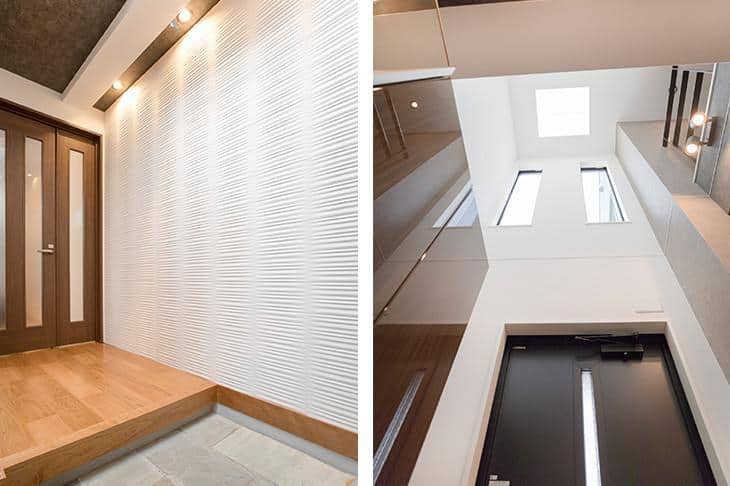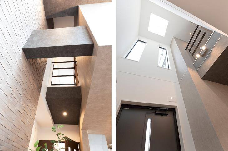 玄関ドアを開けると、そこはゆったりとした玄関ホール。見上げると、2階の天井までつながる大吹き抜けが広がります。天窓と2連の縦型スリット窓から入るやさしい自然光が、家族やゲストをもてなします。