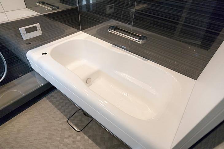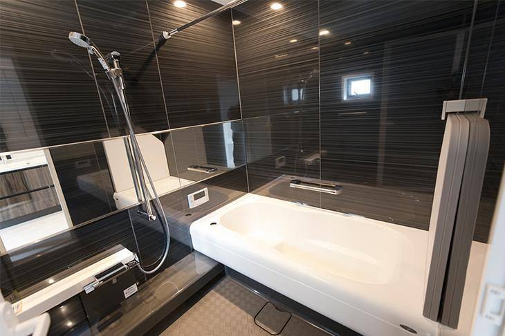 ブラックを基調とした落ち着いた雰囲気のバスルーム。空間の広がりを感じるトクラスの浴槽を採用しています。すばやく乾く床や、お手入れが簡単なバスタブで、時短家事をサポート。体にフィットするバスタブは、半身浴にも便利なカタチです。