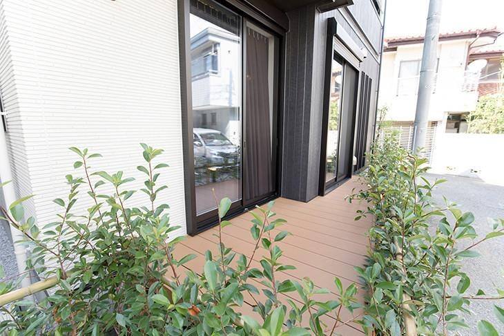 窓の向こうはリビングとひと続きになったテラス。ウッド調のデッキを敷いた居心地のいいスペースです。天然木のような肌ざわりと香りが楽しめるリウッドを採用し、贅沢な見た目とお手入れの簡単さを両立させました。