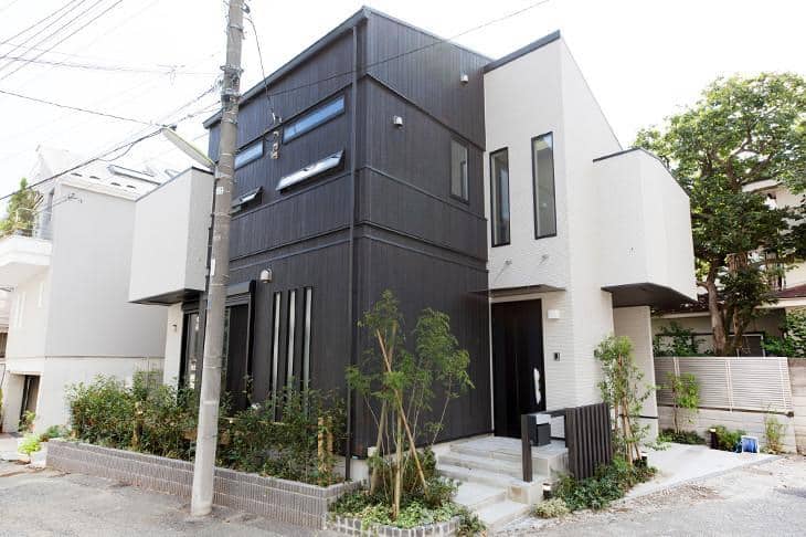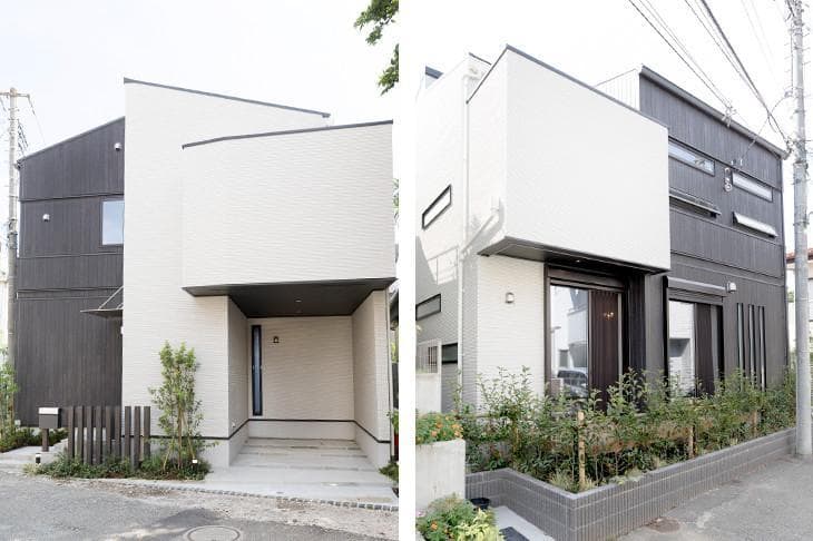 ひときわ目を惹く外観は、白いサイディングの外壁に、黒い木箱がはさまったような個性的なデザイン。白と黒のシャープな雰囲気と木のぬくもり感が同居する、都会的なセンスあふれる佇まいです。