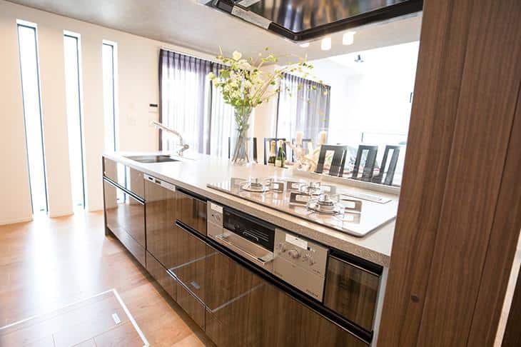 システムキッチンは、タカラスタンダードのハイグレードモデル。光沢のあるブラウンの面材やココア色の人造大理石のワークトップが、ワンランク上のキッチンを演出しています。便利な床下収納もうれしいポイントです。