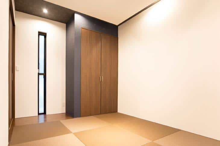 リビングの横には、正方形のふちなし畳を使ったモダンな雰囲気の和室を設けました。家事スペース、居室、ゲストルームなど、多用途に活用できます。