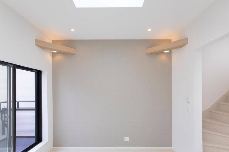 1階廊下の壁とは違うテクスチャーのアクセントクロスで彩られた、2階リビングの「大きな壁」。季節の移ろいや時間帯で表情の異なる光や影を受け、さらに家族が色や形を飾ることで、暮らしを演出するように意図されています。
