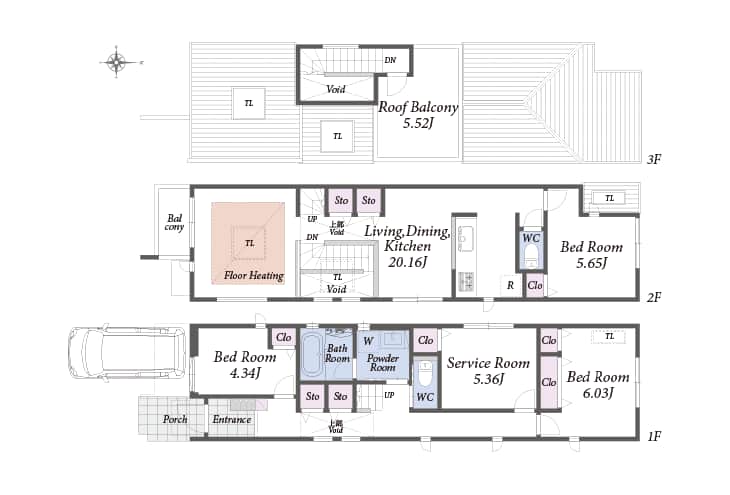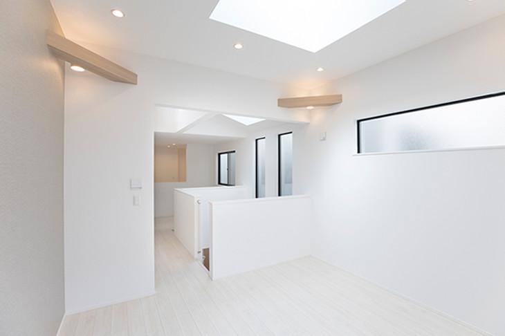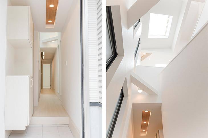 ダウンライトが照らす明るいエントランス。白いポーチタイルとホワイトのフロアが家族やゲストを迎えます。階段まわりと廊下には吹き抜けとスリット窓から自然光が射し込み、光と影の表情が楽しめます。