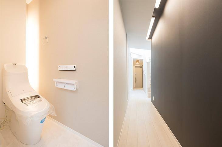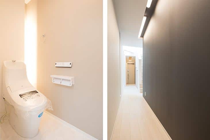 玄関ホールから続く廊下は、寝室やトイレへの動線に。脇に生まれた大きな壁にはダークカラーのアクセントクロスが張られ、黒板ボードのように使えます。トイレはコンパクトながら、間接照明の光に包まれた癒しの空間です。