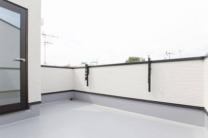 5.52畳のゆったりしたルーフバルコニー。ガーデニングやバーベキューを楽しむなど、アウトドアリビングとして大活躍しそう。設置された物干し用の支柱は、斜め上に引き上げられるタイプ。布団や洗濯物を干すのに便利です。