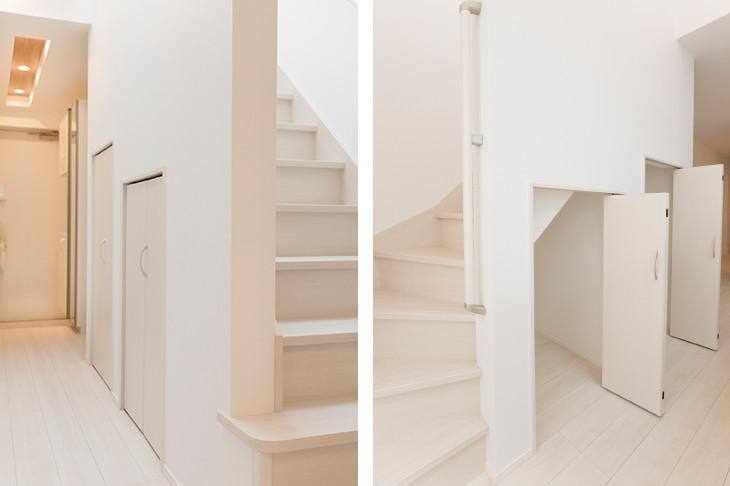 収納庫の多さがこの家の注目ポイント。1階と2階、それぞれの階段下に奥行きのある扉付きストレージを確保しています。1階ならスーツケースやアウトドア用品、2階ならベッドリネンなど、普段は使わないものの収納に重宝しそうです。