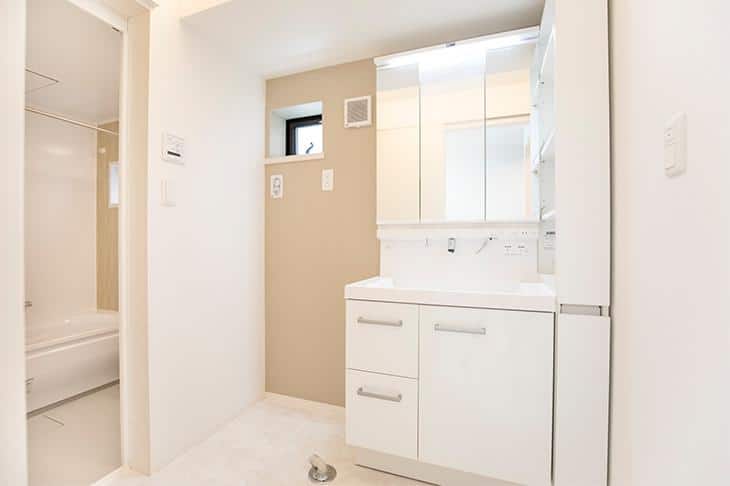 明るいパウダールームはバスルームとフラットにつながっています。洗面化粧台はLIXIL、バスルームはTOTO。ゆったり体を伸ばせるラウンドタイプのバスタブにつかれば、日々の入浴が癒しの時間になるでしょう。