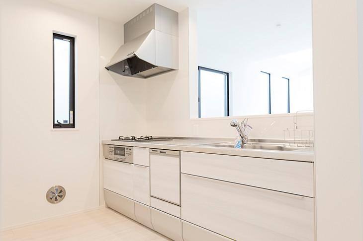 会話を楽しみながら料理や片付けができる対面式キッチンはクリナップ。収納力も十分です。扉の面材は床とコーディネートしてホワイトに。シンク横の水よけと油よけにも白パネルを使用して、室内との一体感を生み出しています。