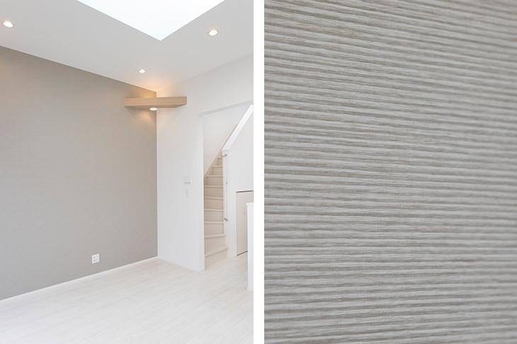 「大きな壁」がテーマのこの家のシンボルは、リビング正面のグレーの壁。モダンな風合いのアクセントクロスが、格調高く空間を彩ります。アートやグリーンを飾るなど、イマジネーションを楽しみながら好みのインテリアにアレンジを。